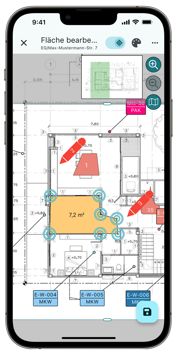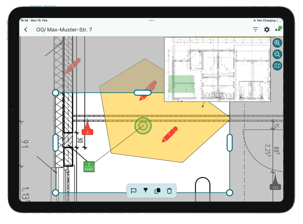 Gerade wenn ein Zustand zu einem späteren Zeitpunkt nicht mehr sichtbar ist, dienen Fotos als Beweis erbrachter Leistung und eines Entwicklungsschrittes. Mit der mobiPlan-App werden die Fotos direkt zusammenhängend mit den wichtigsten Informationen aufgenommen. Um schwer erkennbare Details aufzuzeigen, ist es möglich, diese Stellen visuell hervorzuheben.