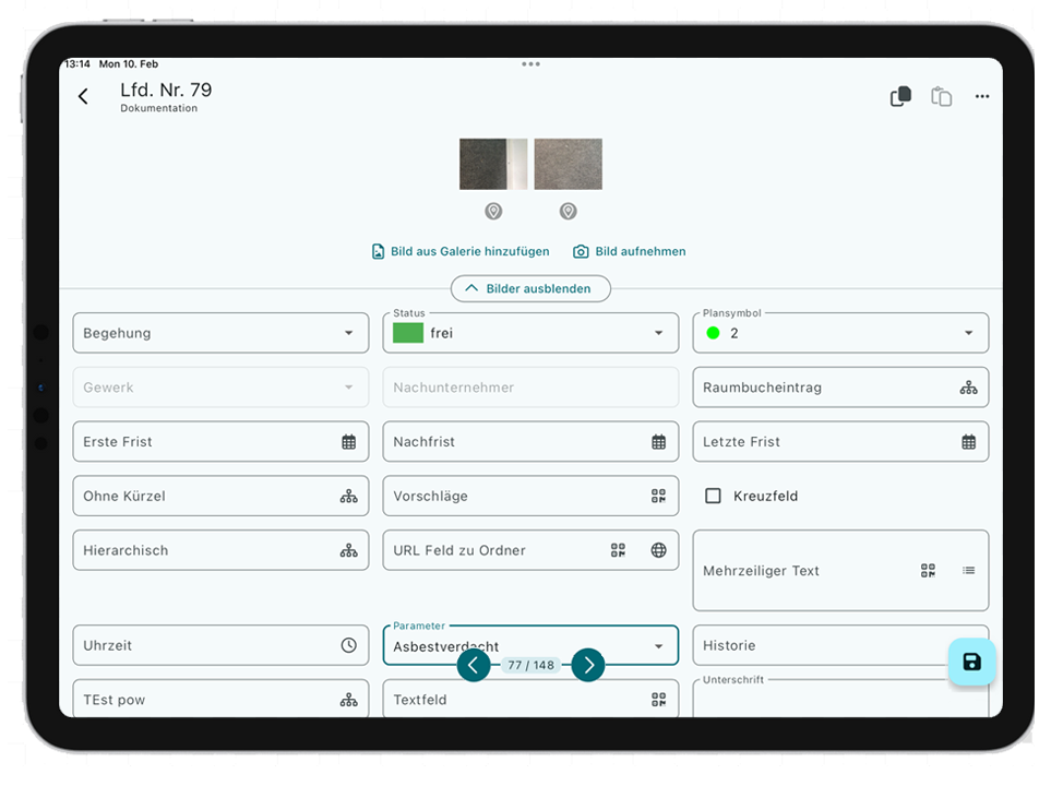 Baustellenbegehungen, Montagedokumentationen, Qualitätskontrollen, Abnahmen und Schadstoffuntersuchungen in Gebäuden erfassen Sie per App mit automatischer Zuweisung von Ort, Foto und Notiz. Anschließend erstellen Sie mit einem Klick Mängelberichte, Schadstoffkataster, Brandschutzdokumentationen und Gutachten oder steuern Sie die Instandhaltung, Reparatur oder Reinigung von Gebäuden und Anlagen bequem im Webportal.
